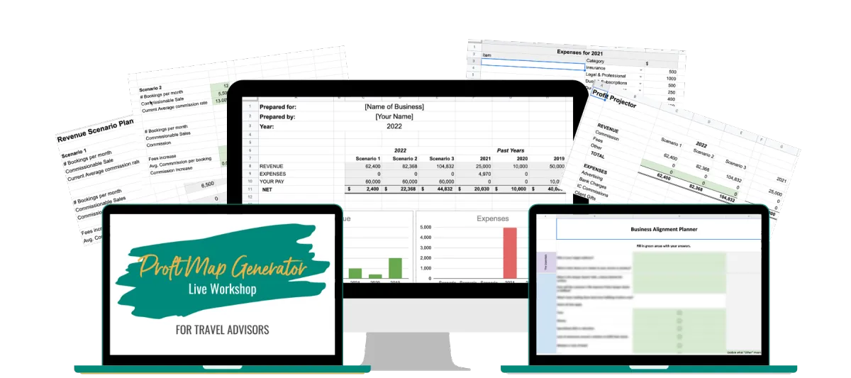 Using the Profit Map worksheets, we'll list out the expenses in your business for the most recent year. Summarize the types of trips you typically plan, factor in any new niche, destination, travel style, and do some calculations to use in our scenario planning.